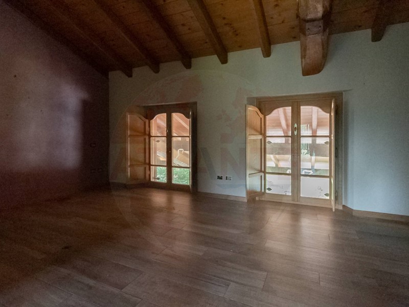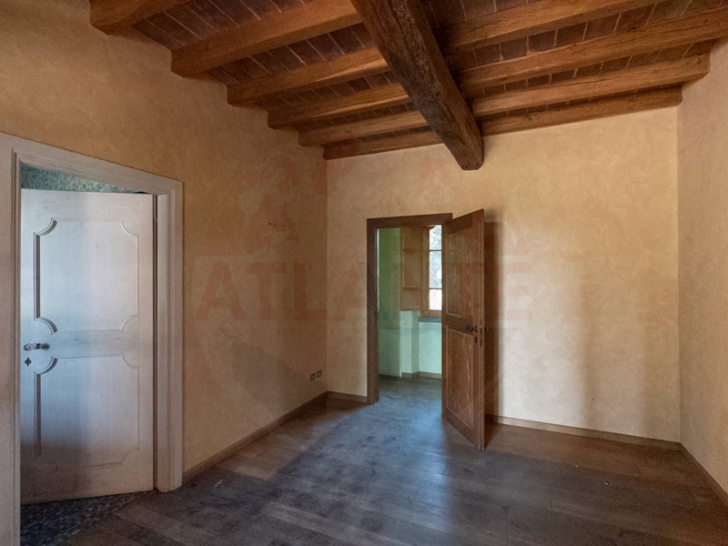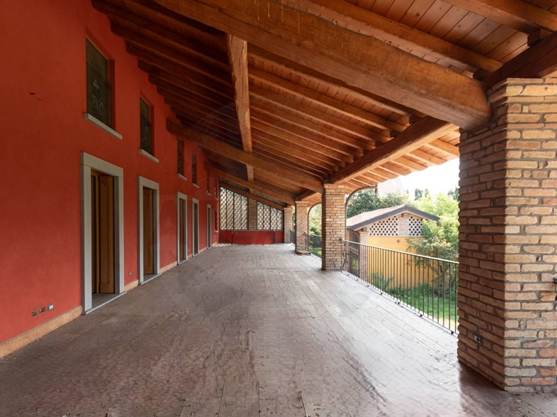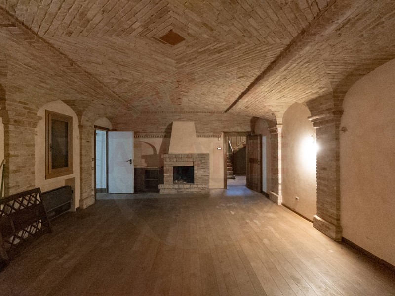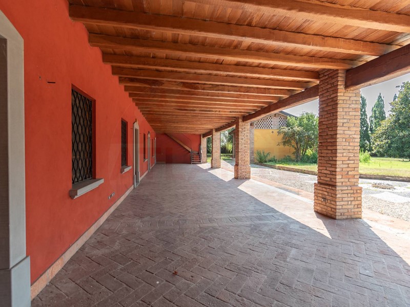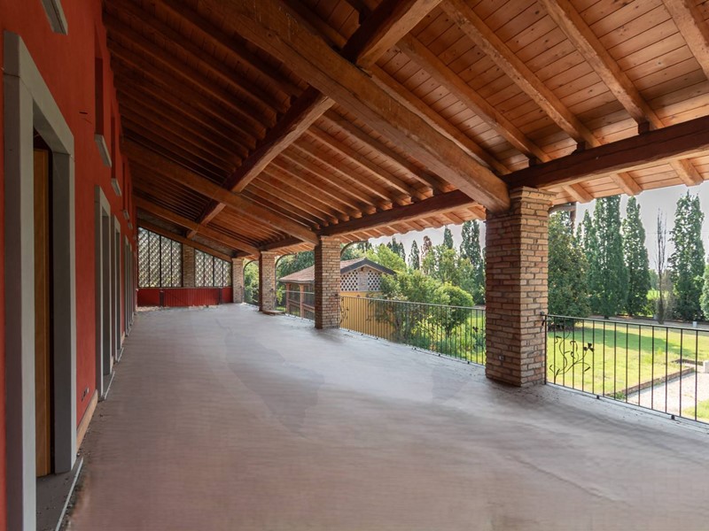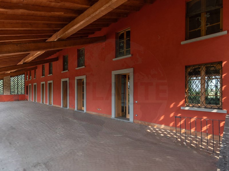 Lunità al piano terra ha completo affaccio sul porticato in tutta lunghezza e presenta un grande e luminoso salone dotato di camino, spaziosa cucina anchessa dotata di camino, atrio che conduce alla zona notte composta da due camere padronali entrambe con bagno en suite e ulteriore bagno di servizio. Completano questa unità la grande taverna, 2 cantine per vini e salumi, locale lavanderia e lautorimessa comune da circa 100 mq.