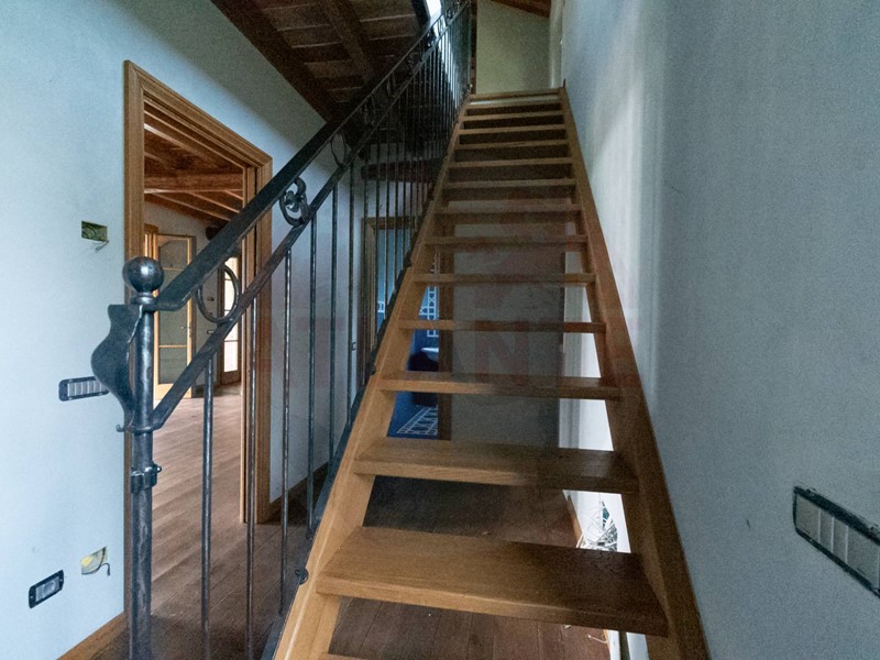 At each end of the large portico are two exclusive staircases leading to the other two residential units, accessible from the loggia. Both are spread over two levels, served by an internal staircase and an elevator. Each unit includes a living room, kitchen, bathroom, master bedroom with an en-suite bathroom, two additional bedrooms, and another bathroom. These two units also have exclusive access to their own cellar and laundry room on the basement level.