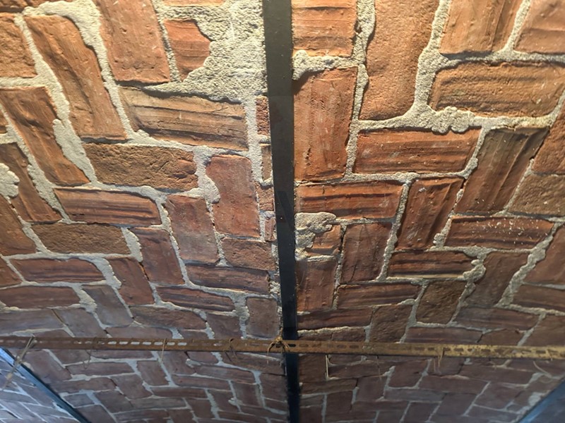 The property, in need of renovation, is spread over several levels and features a spacious ground-floor garage with a characteristic exposed brick ceiling, offering direct access to the living area.