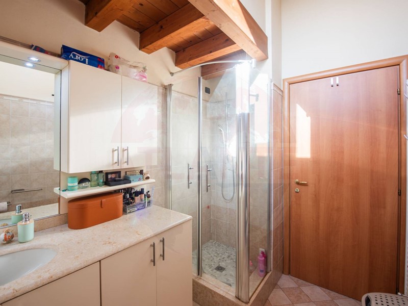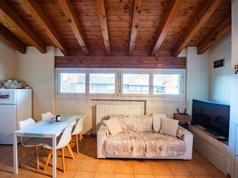 L'appartamento bilocale è composto da un soffitto con travi a vista in legno, dando un maggior tocco di eleganza senza tempo. Esso si trova al secondo ed ultimo piano in posizione finale del complesso residenziale, garantendo una maggiore privacy e riservatezza. Si sviluppa su una superficie totale di circa 65 metri quadrati, di cui 55 metri quadrati calpestabili dove gli spazi interni sono ben distribuiti e ottimizzati al massimo, offrendo un'abitabilità confortevole e funzionale.