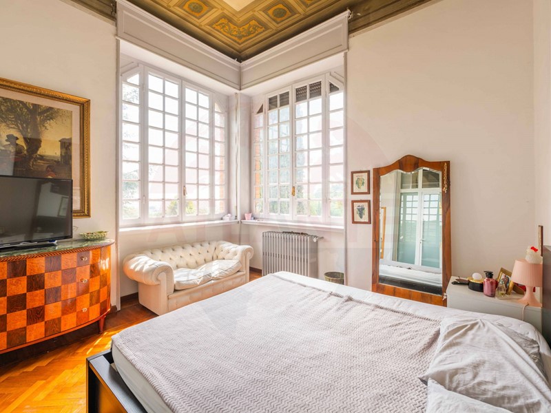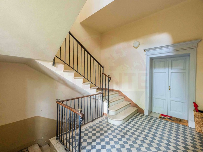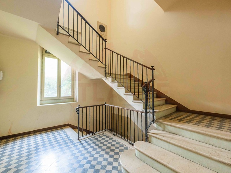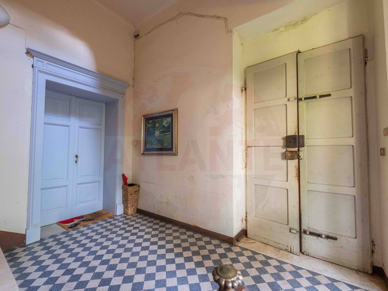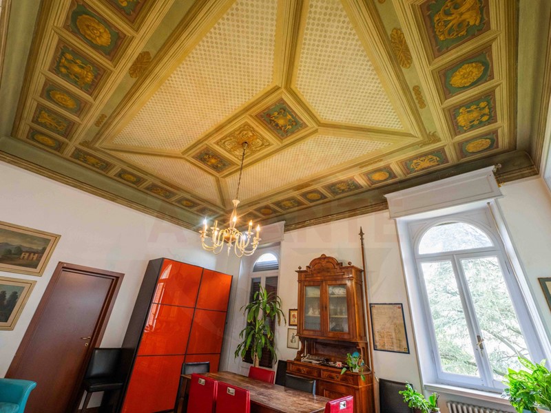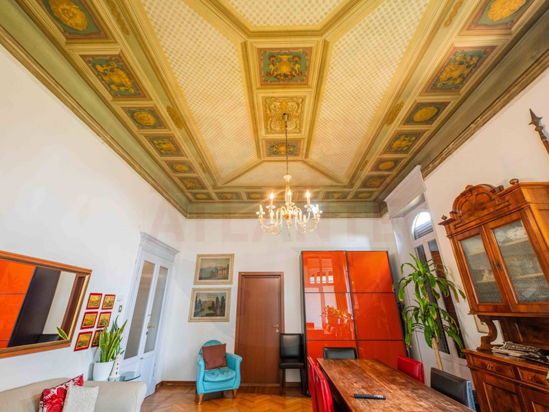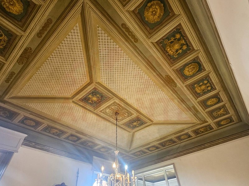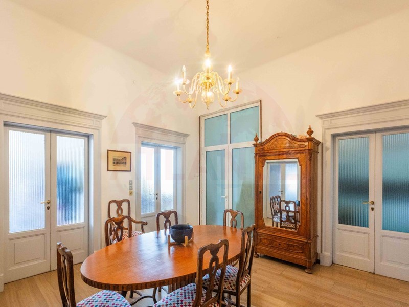 Architettura neoclassica con soffitti decorati, pavimenti depoca e serramenti originali in legno.