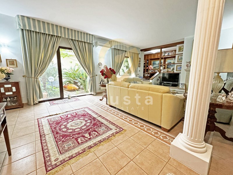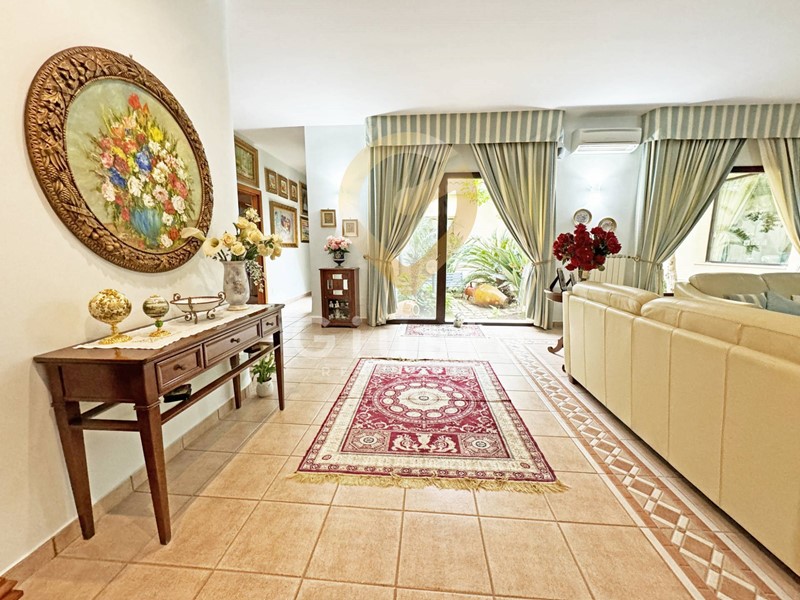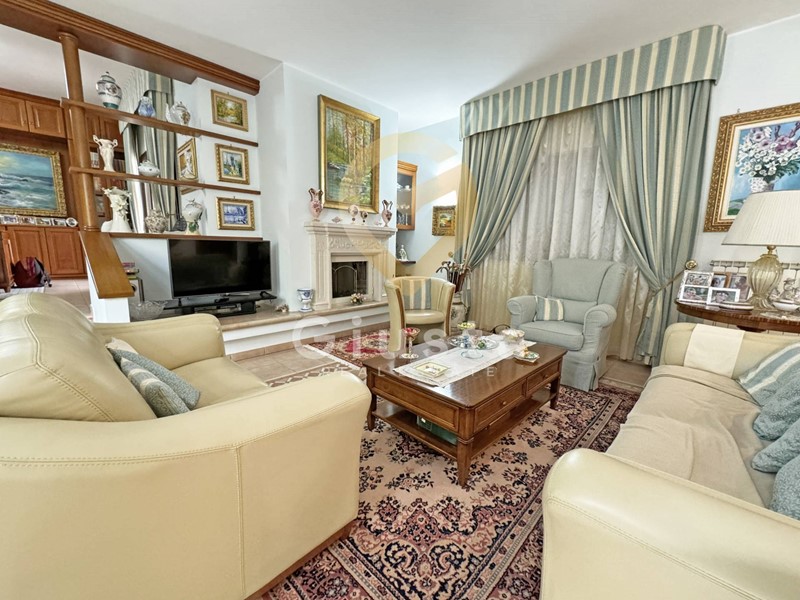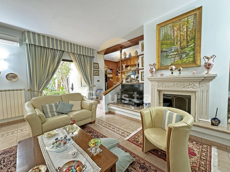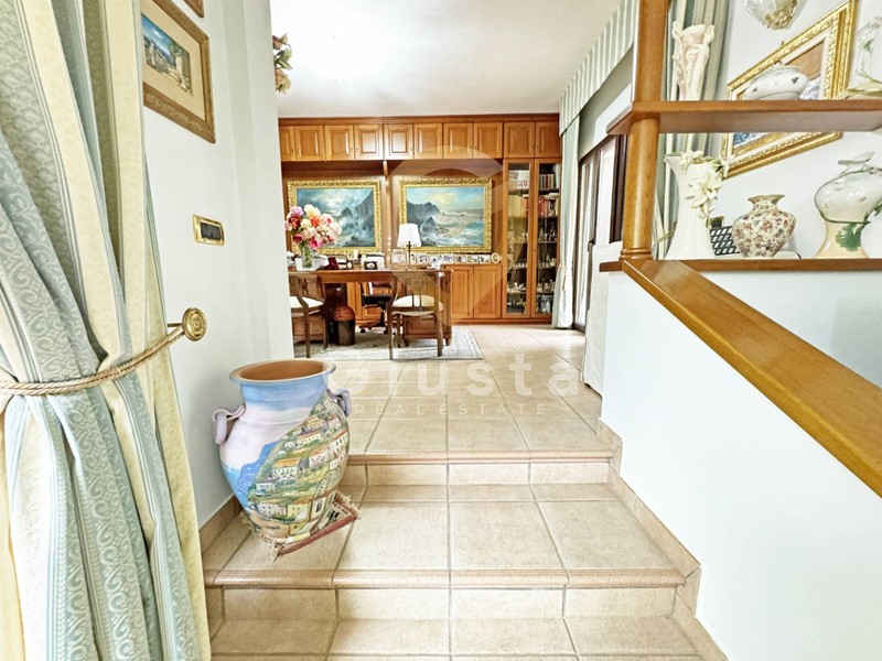 L'ingresso principale conduce ad un luminoso e spazioso soggiorno dove un elegante caminetto e la meravigliosa vista sul giardino rendono piacevoli le serate invernali, dallo stesso si può accedere ad un ampio studio corredato di una libreria costruita su misura in legno massello.