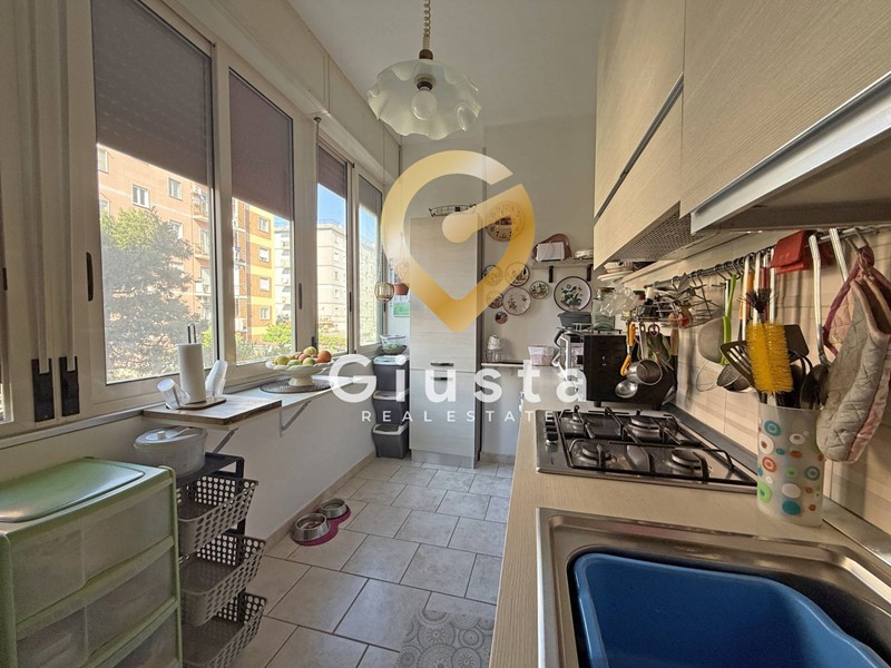 Lappartamento è composto da un ingresso che conduce al luminoso soggiorno, con una cucina separata. La cucina è dotata di un balcone chiuso, che offre uno spazio aggiuntivo utile per lavanderia o ripostiglio. La zona notte comprende una cameretta, due ampie camere da letto e un bagno funzionale.
