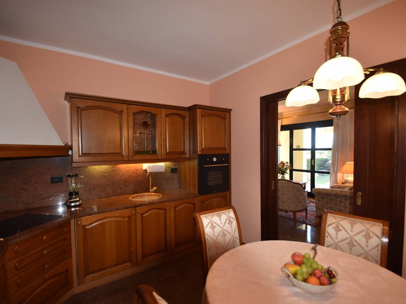 Piano terra: ingresso, accogliente soggiorno con affaccio su portico coperto e giardino di proprietà con vista lago, cucina abitabile, un locale accessorio esterno.
