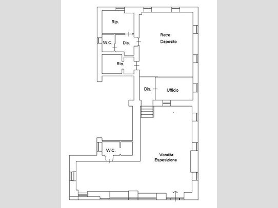 Lingresso del negozio affaccia sulla via principale e consente laccesso ad un grande locale destinato a vendita/esposizione con h. 3.30 e altre due grandi vetrate. Sul retro troviamo un locale adibito ad ufficio, un locale deposito, due ripostigli e due bagni.
