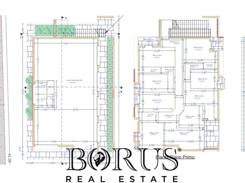 La soluzione, interamente commerciale, dispone, al piano terra, di un ampio vano commerciale con doppi accessori cumulanti un metraggio di 150 mq circa con una superficie adiacente porticata di circa 30 mq. Tramite le scale, si accede ad un secondo livello di circa 180 mq su cui, da progetto, insistono 9 uffici e tre accessori, oltre a balconate terrazzate. Ultimo livello con una bellissima superficie terrazzata di circa 180 mq che permette di immaginare un nuovo ambiente per la fase estiva. Esternamente verranno realizzati parcheggi esclusivi e punti accesso privi di barriere architettoniche nel pieno rispetto delle norme vigenti. Al 2 giugno, lo stabile si presenta in stato avanzato di lavori, pertanto è possibile concepire gli spazi anche in base alle esigenze specifiche.