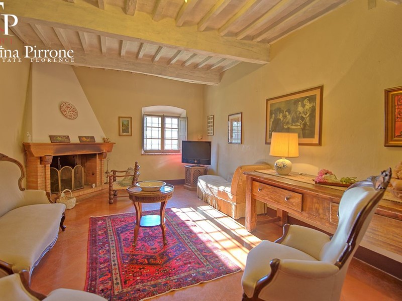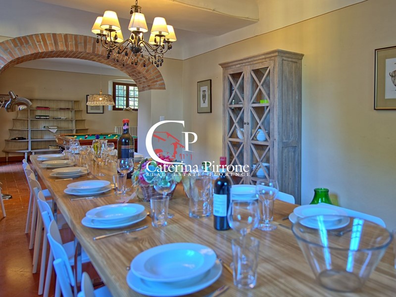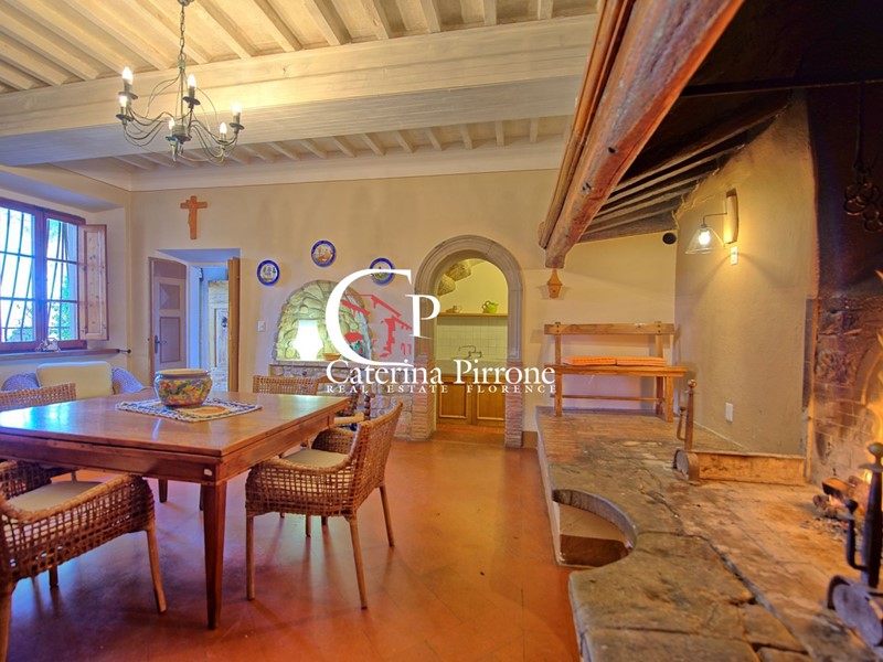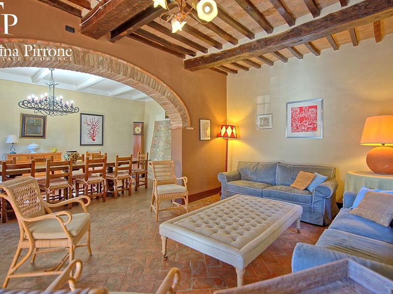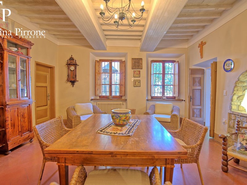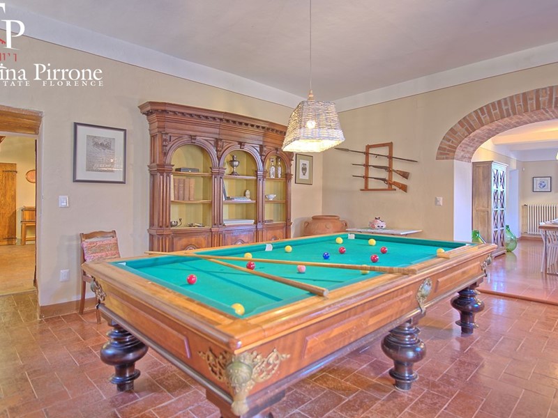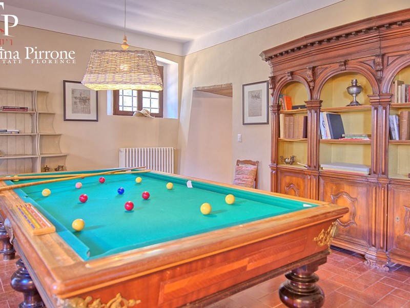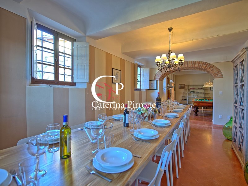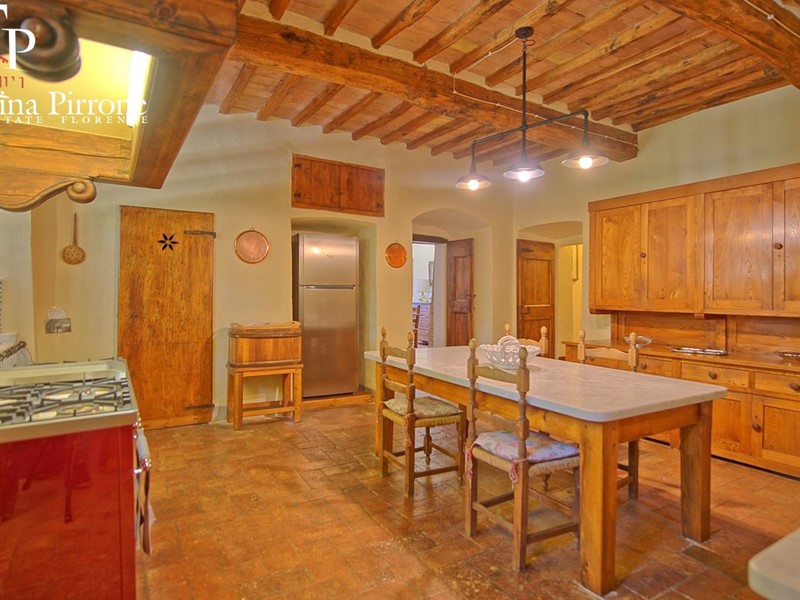 Al piano terreno 8 vani con cucina abitabile, sala da pranzo, salotti con camini antichi, camera con servizio e altri vani ad uso vario, accesso alla cantina scavata nella pietra. Al piano primo ampio salone con camino e accesso al balcone panoramico e 8 camere con 5 bagni. Al piano superiore soffitta con altri 4 vani e accesso alla torretta panoramica con vista sulla campagna toscana a 360 gradi.