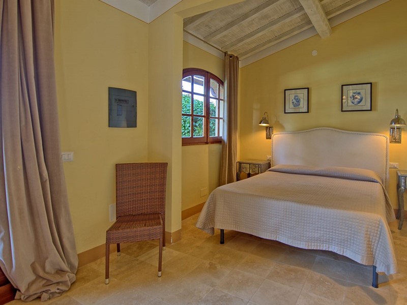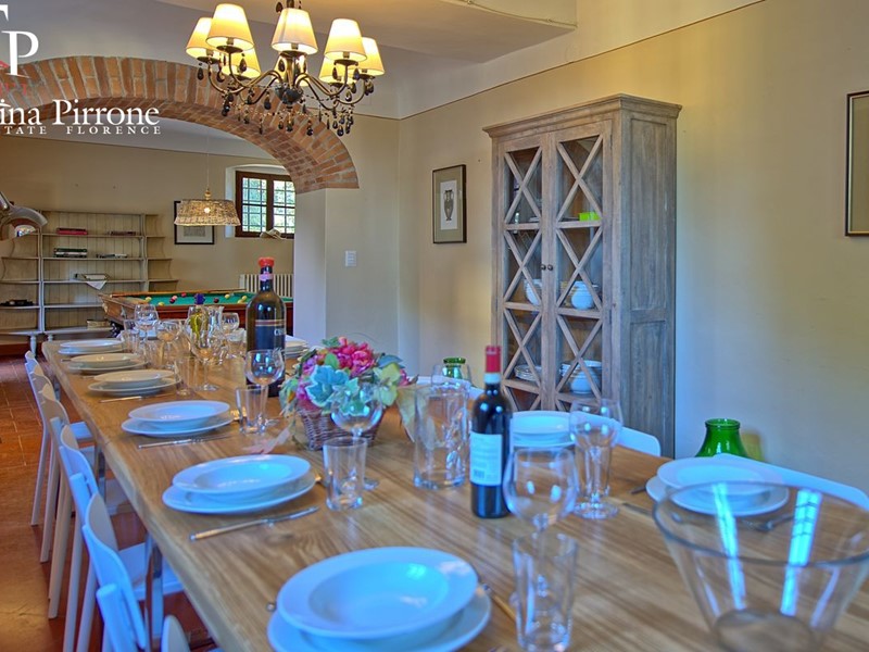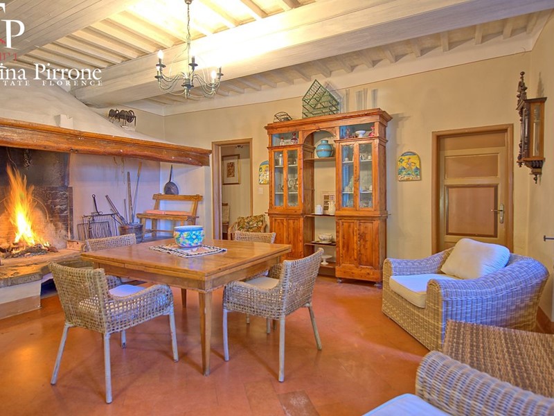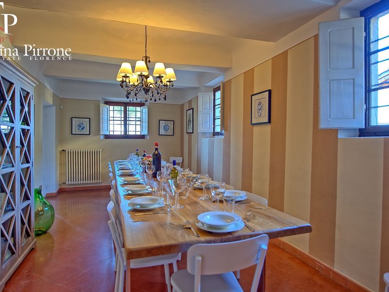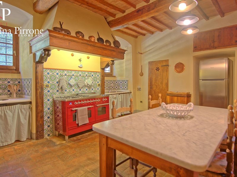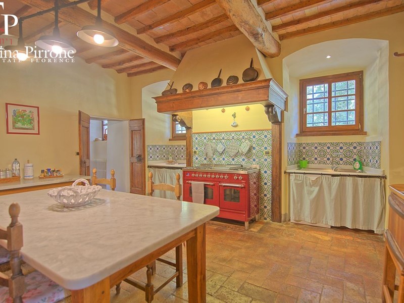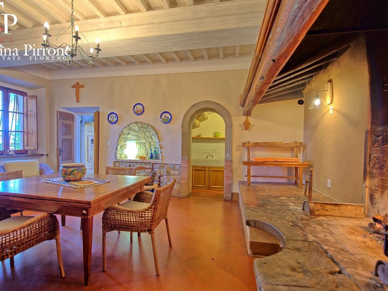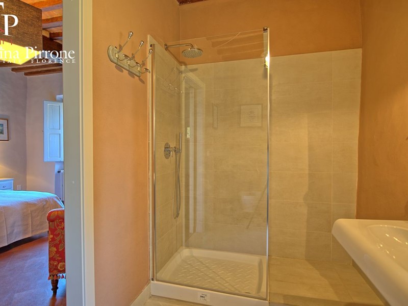 Al piano terreno 8 vani con cucina abitabile, sala da pranzo, salotti con camini antichi, camera con servizio e altri vani ad uso vario, accesso alla cantina scavata nella pietra. Al piano primo ampio salone con camino e accesso al balcone panoramico e 8 camere con 5 bagni. Al piano superiore soffitta con altri 4 vani e accesso alla torretta panoramica con vista sulla campagna toscana a 360 gradi.