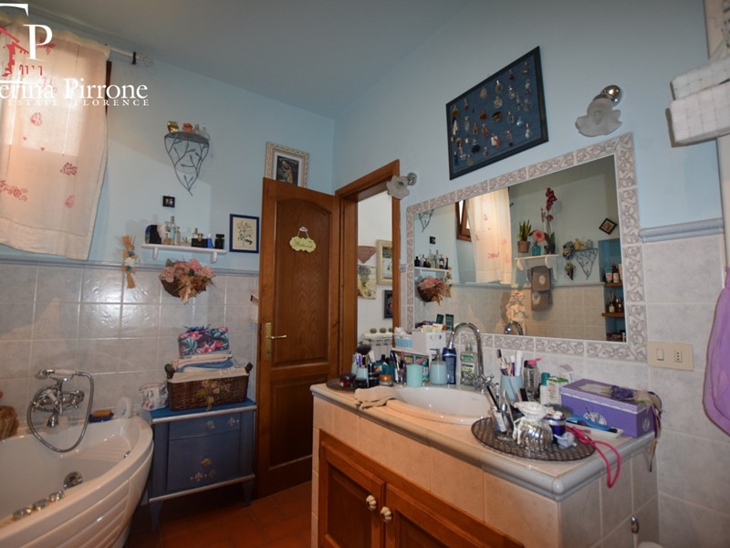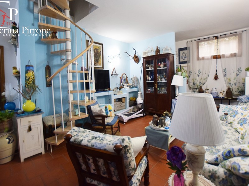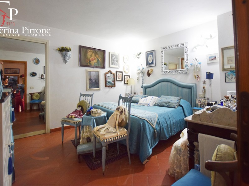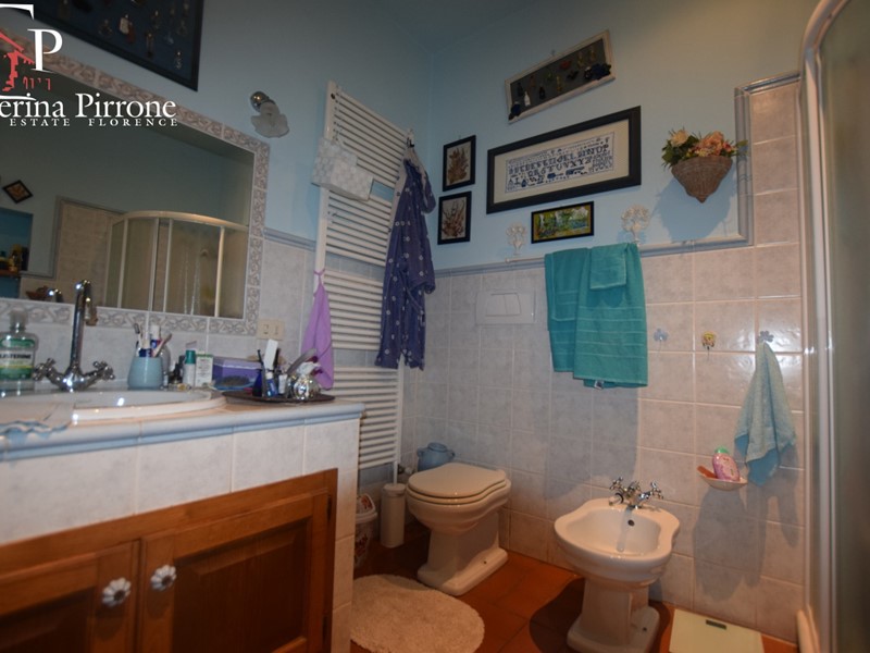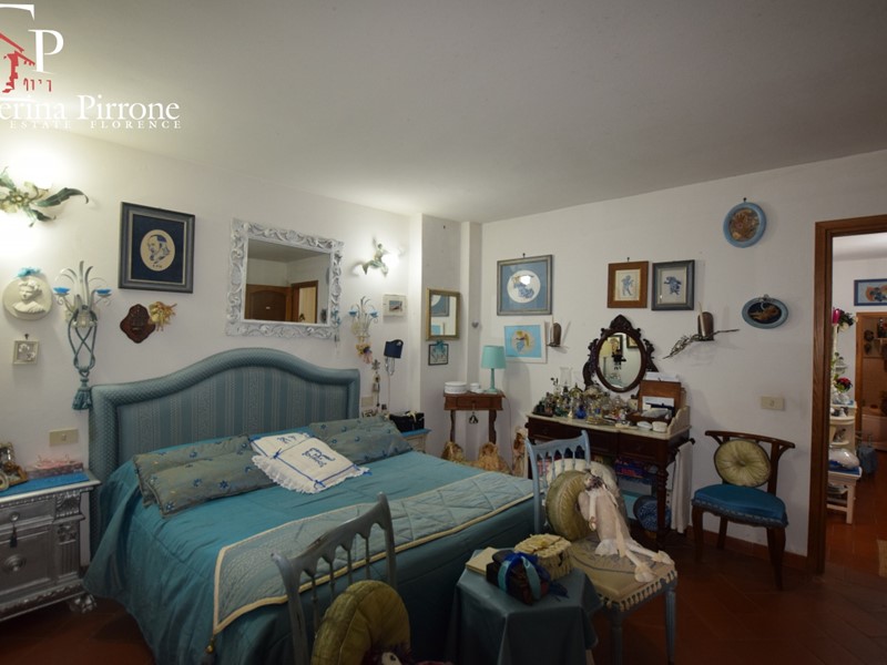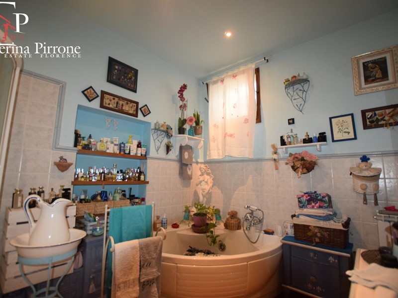 Greve in Chianti, località Chiocchio, a 15 minuti da Impruneta e Grassina, in campagna, ma vicino alla strada principale e ai servizi, VENDESI porzione di villa bifamiliare disposta su due livelli. E' composta da ingresso dal giardino sull'ampio soggiorno, cucina abitabile con accesso al vano dispensa/lavanderia, camera da letto matrimoniale e servizio finestrato con vasca idromassaggio e doccia. Al piano superiore, collegato da scala a chiocciola o con accesso indipendente, troviamo cucinotto e tinello, camera matrimoniale, bagno finestrato e altro piccolo vano adatto anche a studio, oltre a soffitta praticabile. Completano la proprietà bella terrazza arredata con zona relax e forno/camino, garage (possibile cambio di destinazione) che accede direttamente al soggiorno del piano terreno e al vano lavanderia. Riscaldamento autonomo. Giardino terrazzato di mq.800 con piscina fuori terra e orto. Pozzo privato. Da rimodernare. Euro 495.000 VILL213