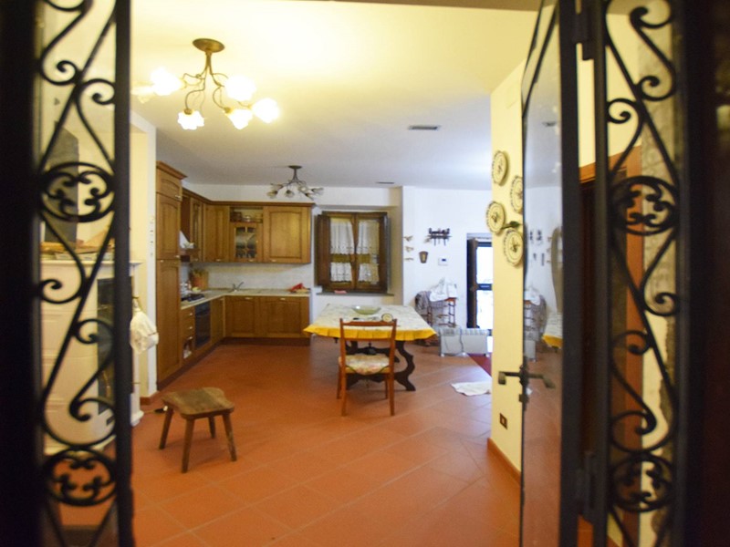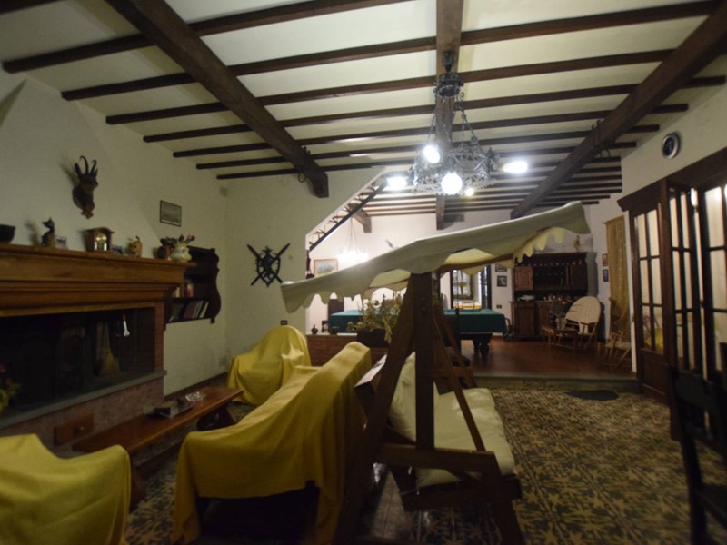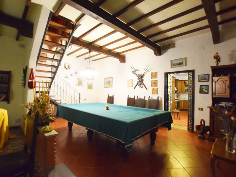 La parte principale si sviluppa su 2 livelli. Al piano terra troviamo salone di mq.80 circa con camino e biliardo, cucina di mq.40 circa (entrambi con pavimenti in cotto) e bagno, oltre a vano tecnico con caldaia a aria alimentata a gasolio (e possibilità di allaccio al metano), ma viene usata la stufa ventilata a legna. Al primo piano ci sono 3 camere matrimoniali e una singola, oltre al bagno. Sopra c'è la mansarda con ingresso indipendente (accatastata a sè e vendibile anche separatamente), composta da ampio ingresso, cucina, 3 camere matrimoniali, una singola e bagno.