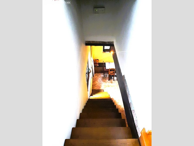 Unelegante scala di legno massello conduce al primo piano con quattro camere ed un bagno con doccia.