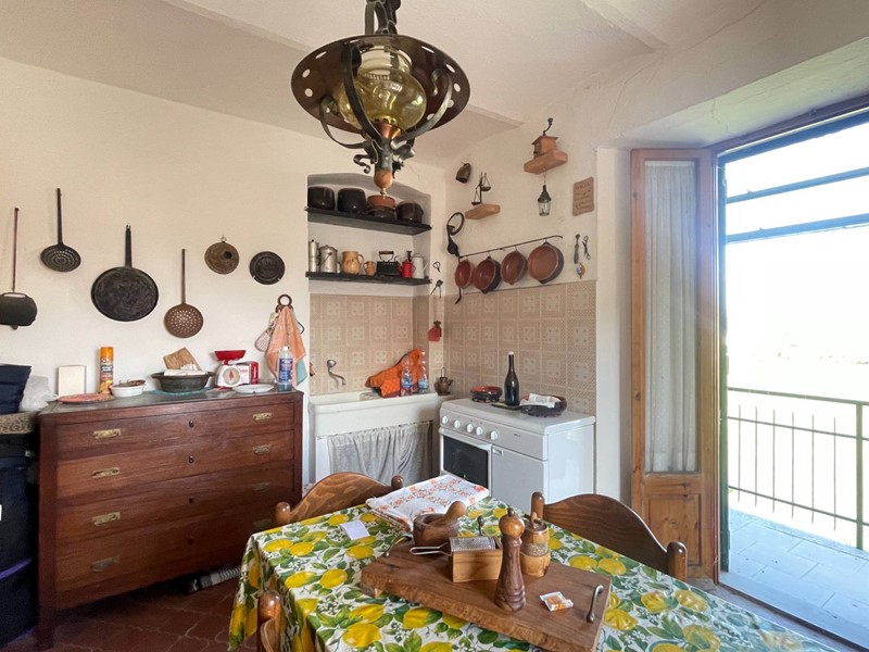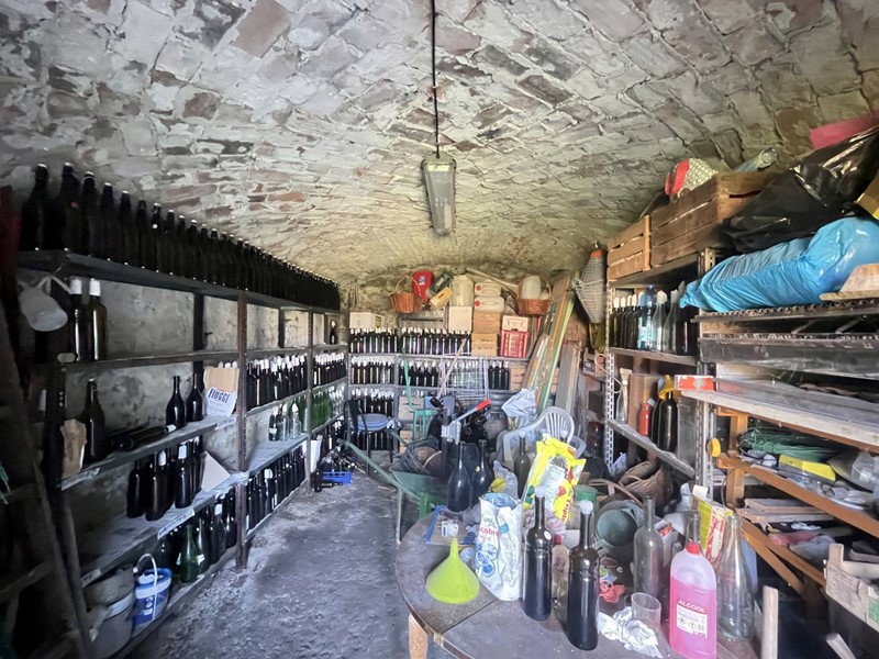 La cantina/taverna al piano terra, con suggestivi soffitti a volta, offre uno spazio versatile e affascinante, ideale per riunioni familiari o serate con amici. L'appartamento al primo piano dispone di due vani luminosi, un balcone da cui ammirare la vallata aperta e un servizio igienico funzionale.