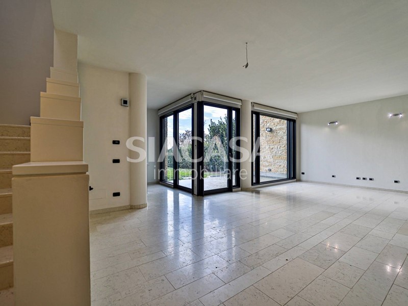 All'interno, lampio soggiorno si apre grazie alle vetrate verso il giardino, offrendo un ambiente accogliente e perfetto per il relax e la socializzazione. La cucina abitabile, anchessa vetrata, si affaccia sul portico e sul giardino, rendendo ogni pasto unesperienza immersa nella bellezza naturale. Completano il piano terra una camera matrimoniale con bagno privato, perfetta sia come raffinata suite per gli ospiti, sia come studio o ufficio.