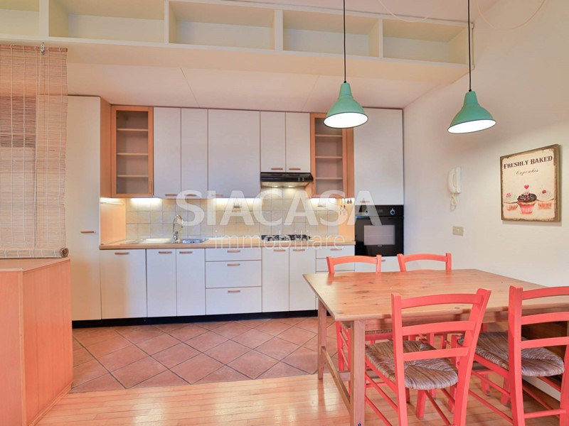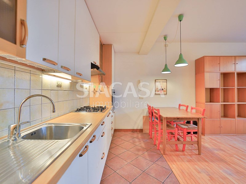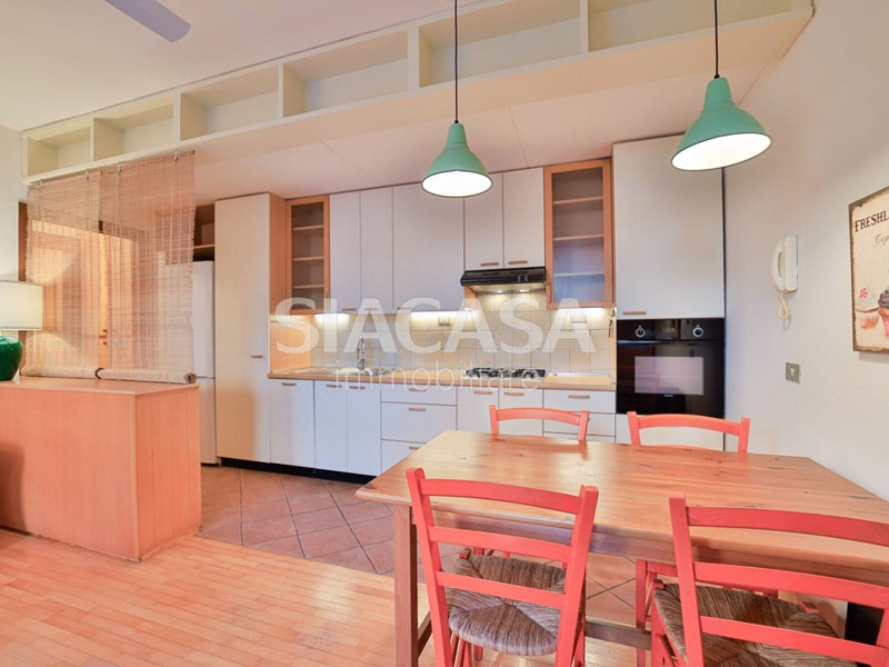 Le finiture in parquet donano calore e charme a ogni ambiente, mentre la zona cucina e il bagno sono valorizzati da un elegante tappeto in ceramica.