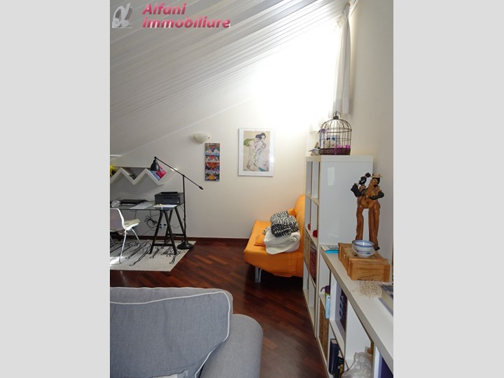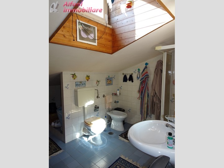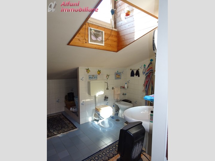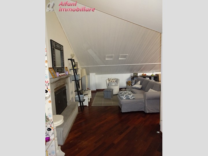 L'immobile è così suddiviso: ingresso su soggiorno da cui si accede ad ampia terrazza, cucina con balcone, 1 camera matrimoniale, 1 camera singola, 1 bagno con doccia al piano secondo; scala interna che porta al piano terzo dove si trovano soggiorno mansardato con caminetto, vano di passaggio, 1 camera matrimoniale con bagno di servizio.