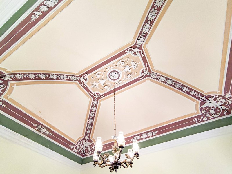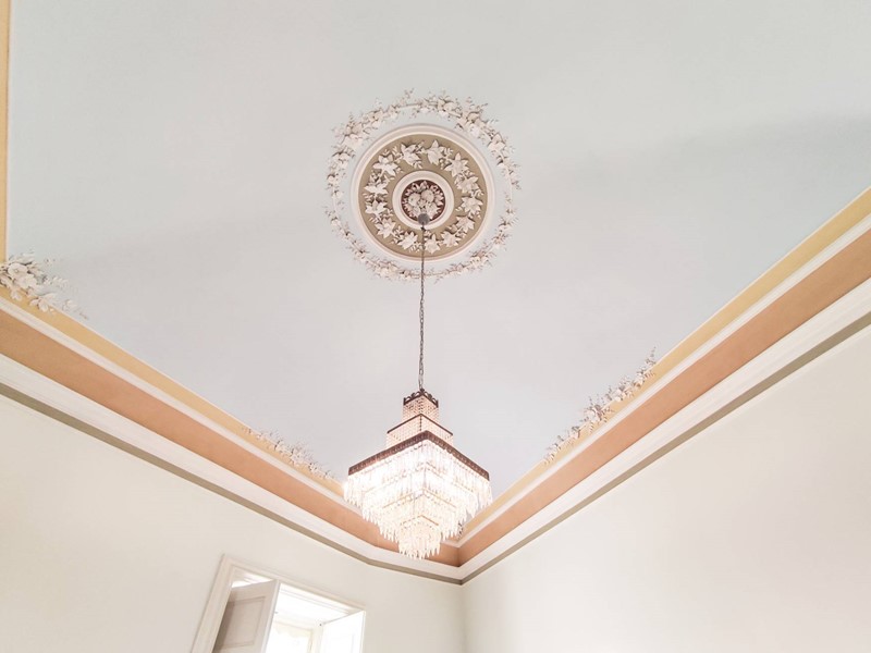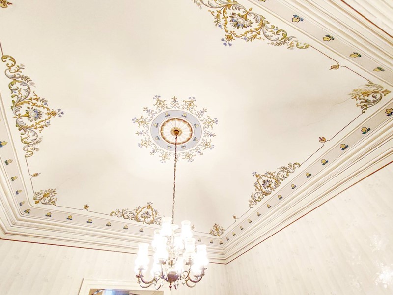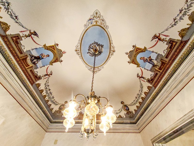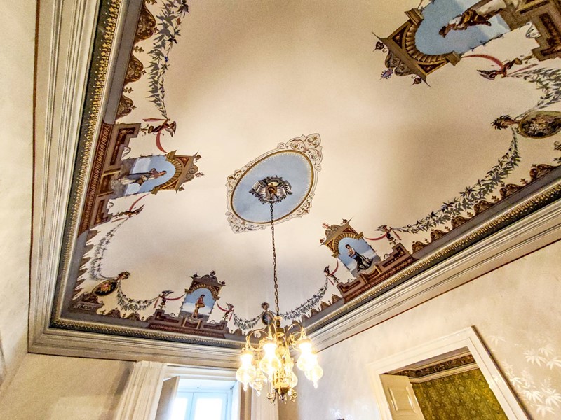Da una signorile scala interna accediamo al secondo piano del Palazzo dove tutti gli ambienti oltre agli affreschi presentano le volte con gli stucchi.