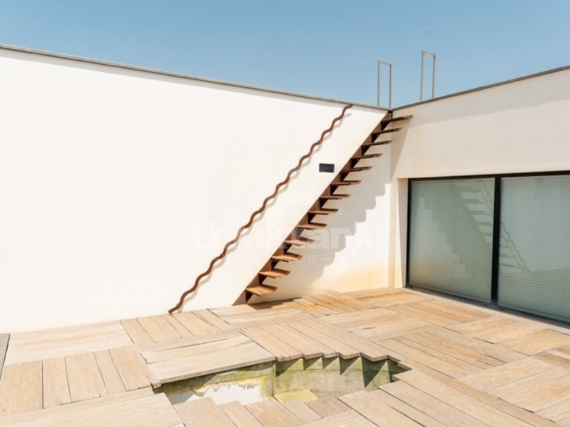 Al primo piano infine vi è la camera matrimoniale, cucina, bagno e guardaroba con anche una zona giorno che si affaccia su una terrazza caratterizzata da una particolarissima vasca zen.