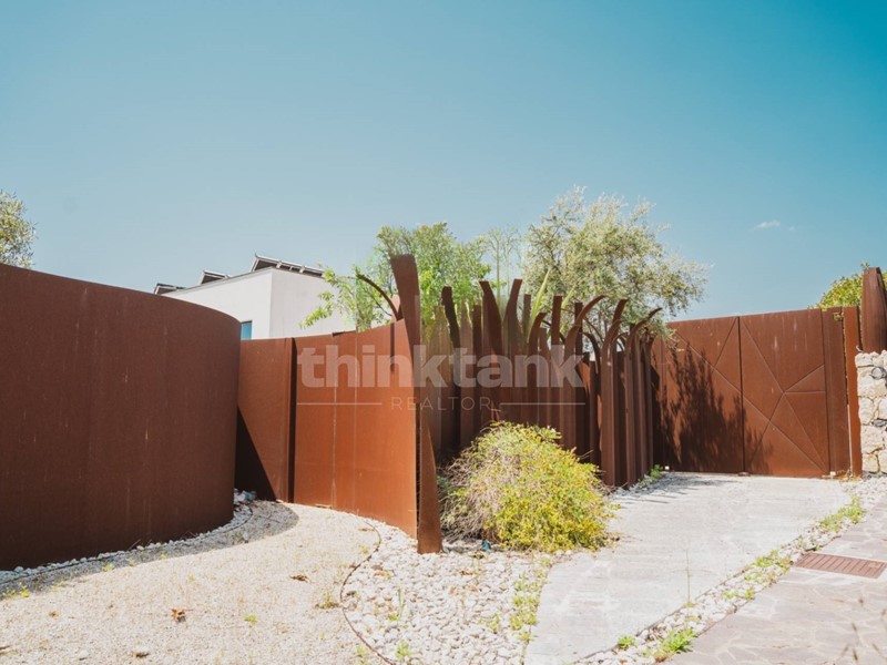 Al piano terra invece vi è la zona living caratterizzata da cucina, un bagno, dispensa, sala pranzo e soggiorno con affaccio su veranda coperta caratterizzata da due elementi in acciaio Corten.