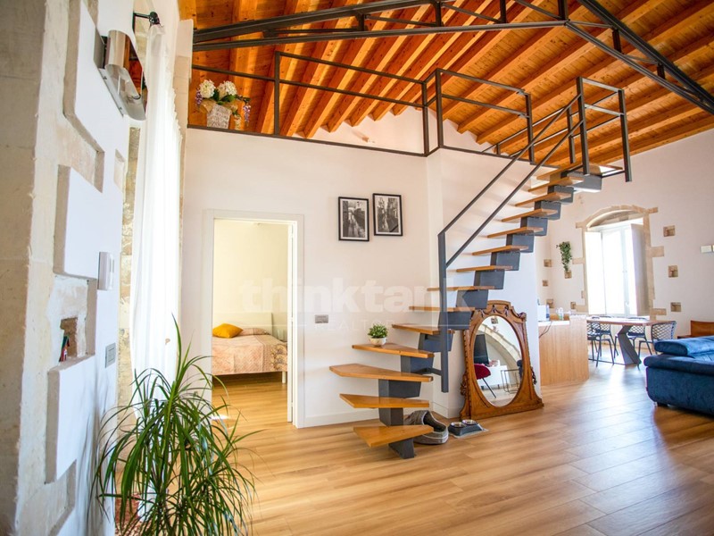 Primo appartamento (principale)L'appartamento più ampio si apre su un elegante ingresso con corridoio. Sulla sinistra troviamo un luminoso studio con affaccio sulla strada. Proseguendo, ci accoglie un ampio e raffinato soggiorno caratterizzato da una modernissima scala con gradini in legno che conduce al primo piano. Qui si sviluppa un open-space dedicato alla zona cucina-soggiorno, impreziosito da un doppio balcone che dona luce naturale agli ambienti.