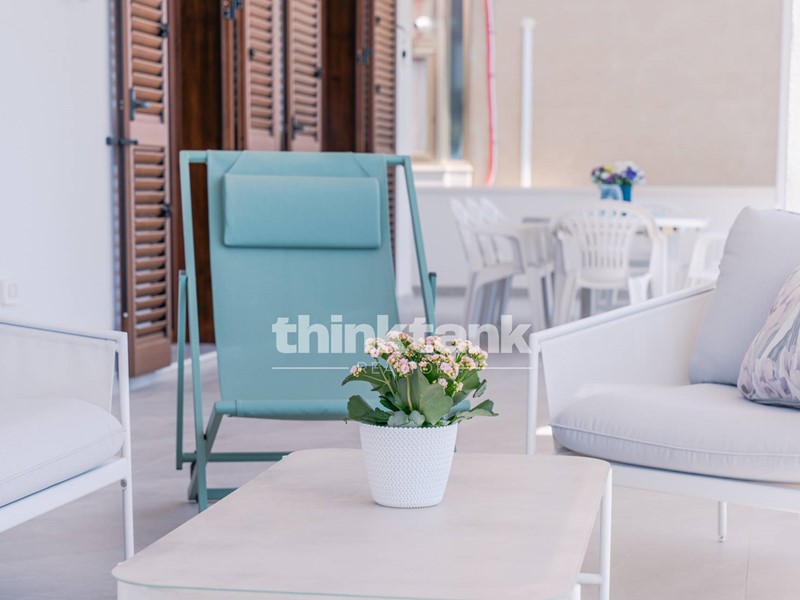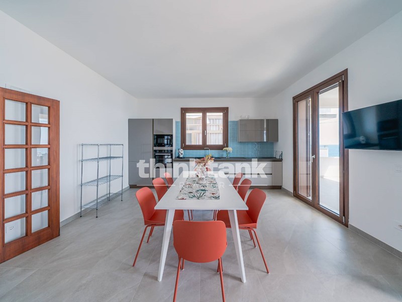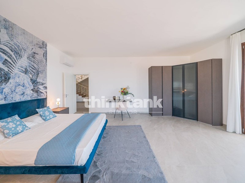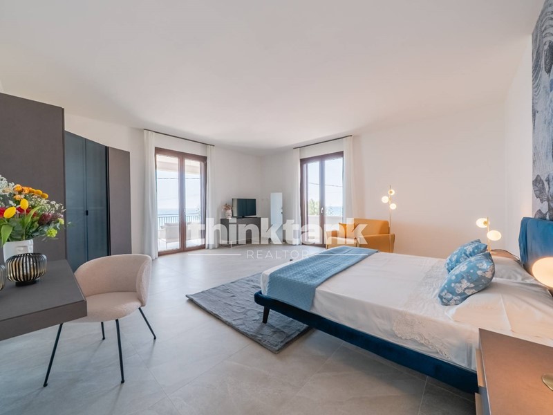 Primo piano: seconda cucina con accesso a un terrazzo panoramico vista mare, zona pranzo esterna con salottino e grande tavolo per pranzi e cene allaperto. Completano il livello altre quattro camere da letto e due bagni.
