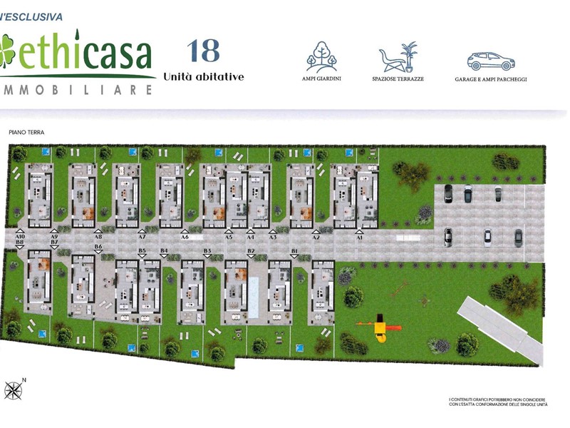 Questo nuovo progetto prevede spazi comuni di notevole superficie, adibiti a posti auto/moto/bici e un ampio giardino attrezzato: un vantaggio esclusivo e poco presente in contesti simili.