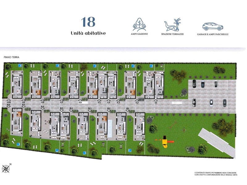 Giardino condominiale piantumato, provvisto di impianto d'irrigazione automatico, di qualche gioco per bimbi e qualche panchina.