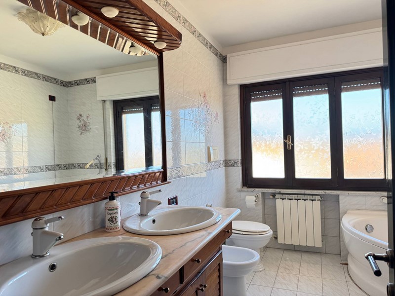 Il bagno è dotato sia di vasca che di doccia, per soddisfare ogni esigenza. Una delle caratteristiche è l'ampia vetrata che illumina la zona giorno, collegandola alla spaziosa veranda panoramica. Qui potrai goderti momenti di relax all'aperto, magari organizzando un barbecue con amici e familiari.