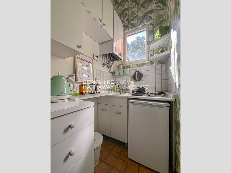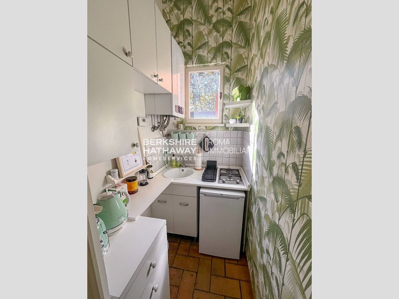 Cucinotto Indipendente e Funzionale: Il cucinotto è separato e completamente attrezzato, decorato con carta da parati a tema tropicale che aggiunge un tocco di freschezza e originalità. La finestra garantisce luce naturale e una ventilazione adeguata, essenziale per una cucina pratica e piacevole.
