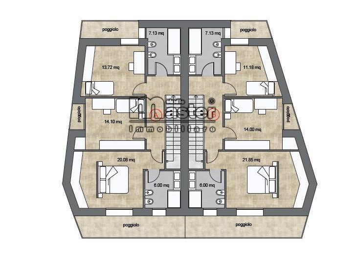 Al piano primo si accede alla zona notte con 3 ampie camere da letto, tra cui la patronale esposta a sud-est di 21mq con bagno privato e finestrato di 6mq e poggiolo, la seconda stanza di 14mq con poggiolo privato, la terza stanza di 11mq anch'essa con poggiolo privato ed un secondo bagno sempre finestrato di 7mq.