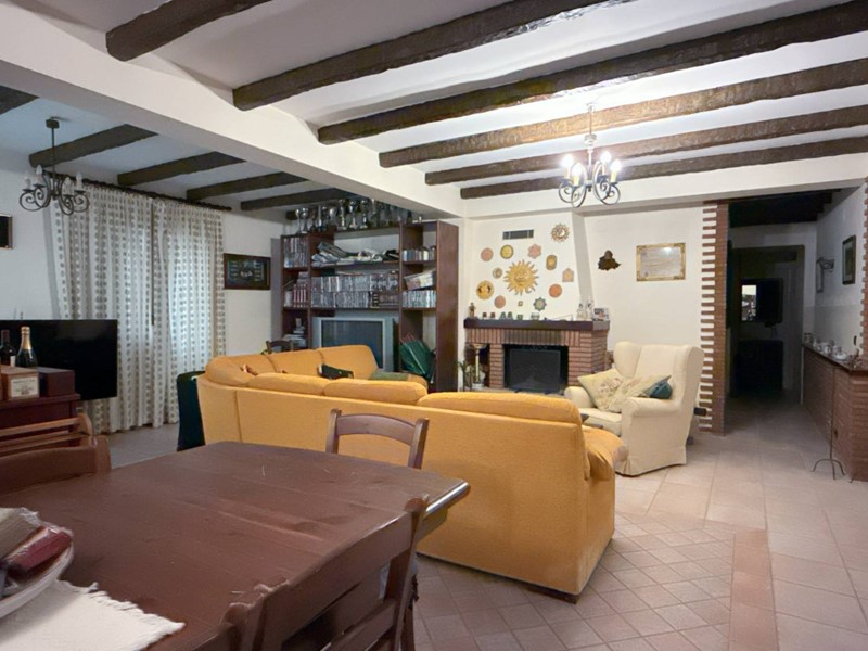 L'ampio e luminoso soggiorno si affaccia su un elegante patio esterno, perfetto per momenti di relax e per pranzi all'aperto.