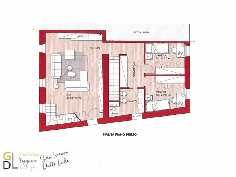 Al 1° piano troviamo sala, due camere e bagno.