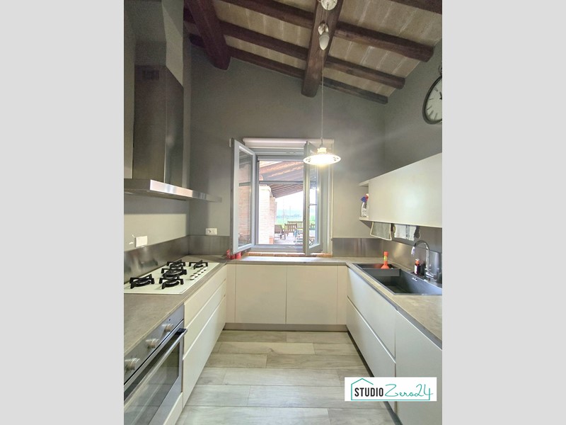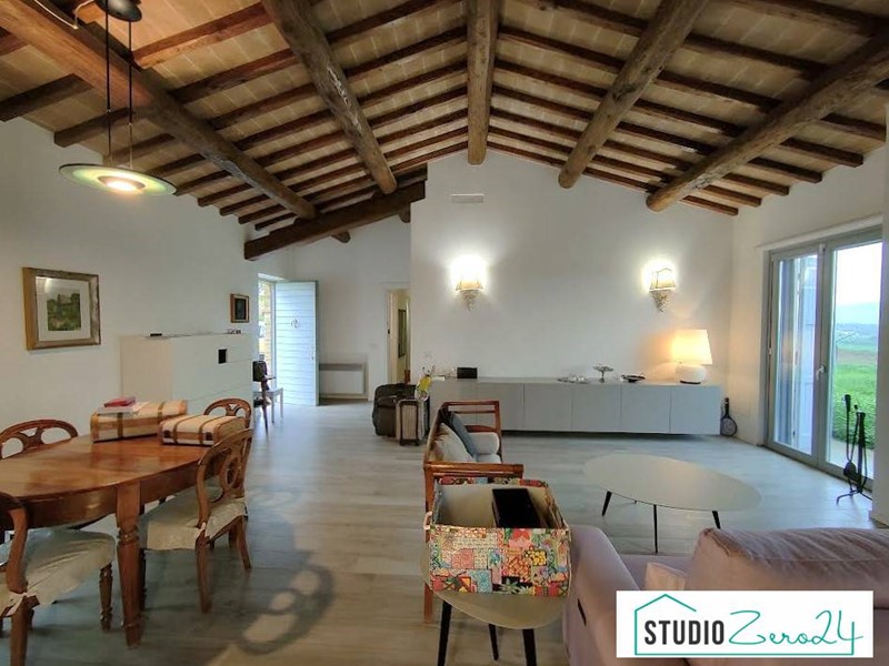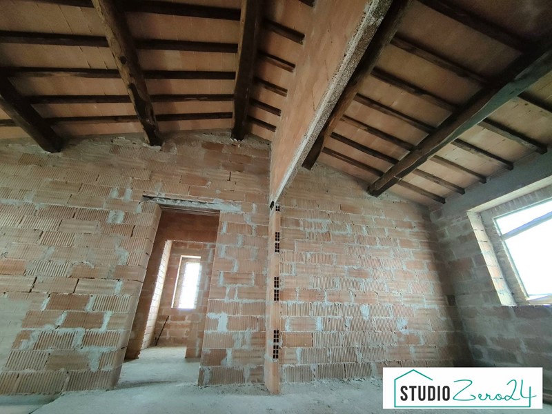 Piano Terra: Ampio soggiorno (con predisposizione camino), cucina abitabile con accesso diretto a un portico panoramico di 37 mq, dispensa e bagno.