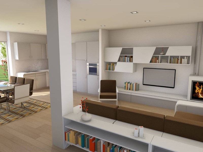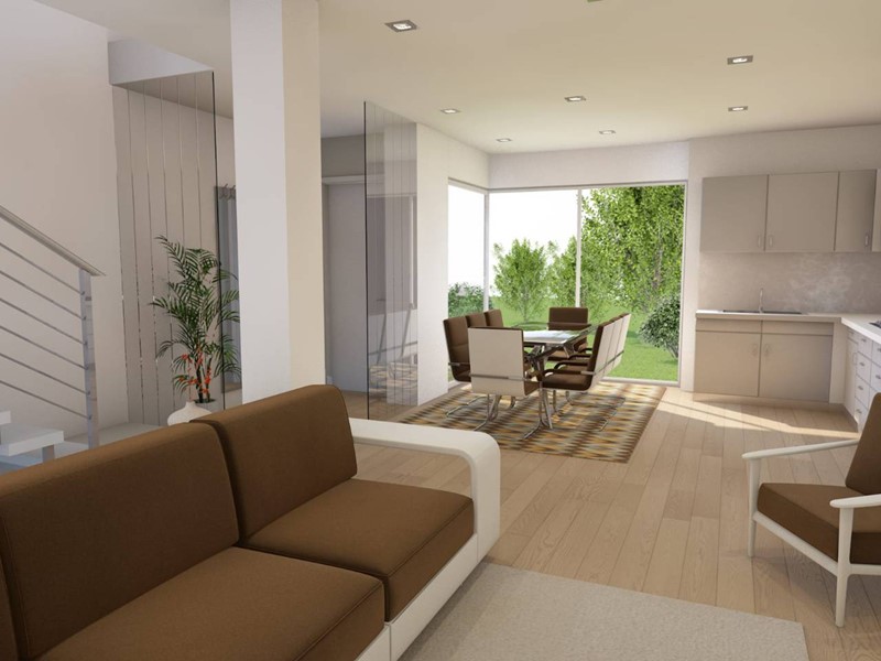 ingresso, ampio soggiorno pranzo con angolo cottura, due camere da letto di cui una matrimoniale ed una singola, due bagni e garage.