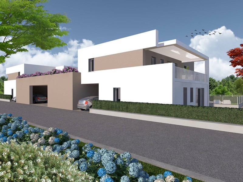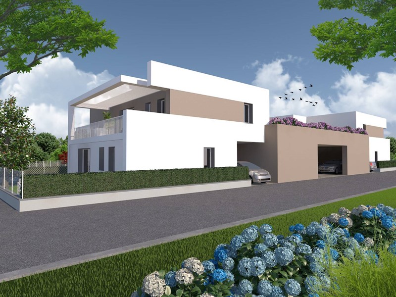ingresso, soggiorno pranzo grande con cucina a vista, tre camere da letto di cui una matrimoniale e due singole, due bagni e garage a piano terra.