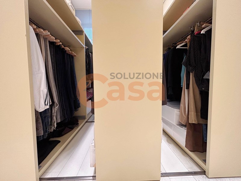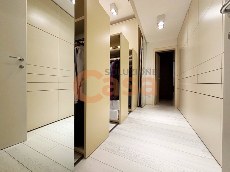La maggior parte degli arredi è realizzata su misura in funzione della stanza e della luce. La cabina armadi, unica nel suo genere, è realizzata con binari scorrevoli.