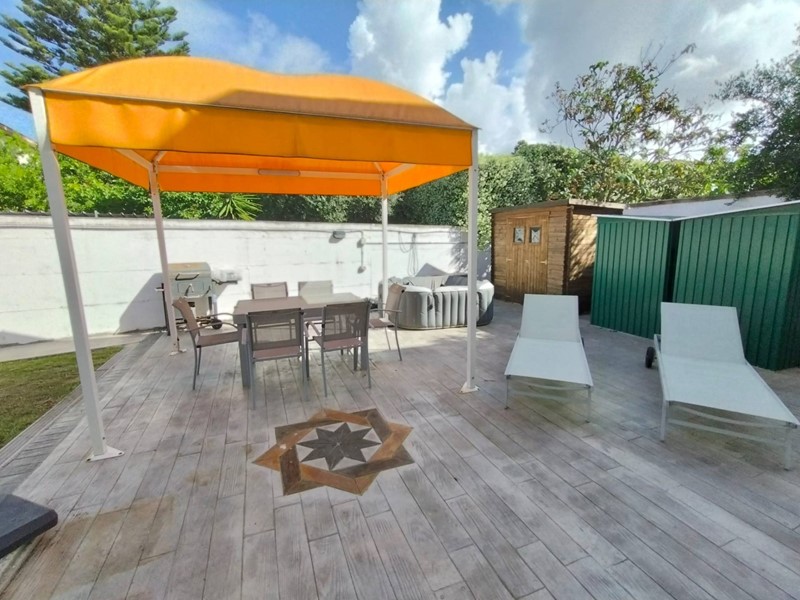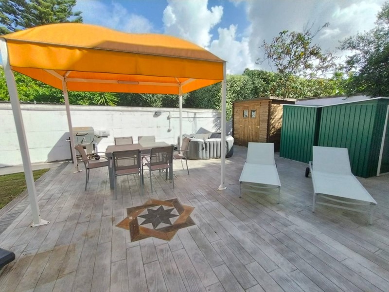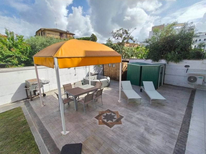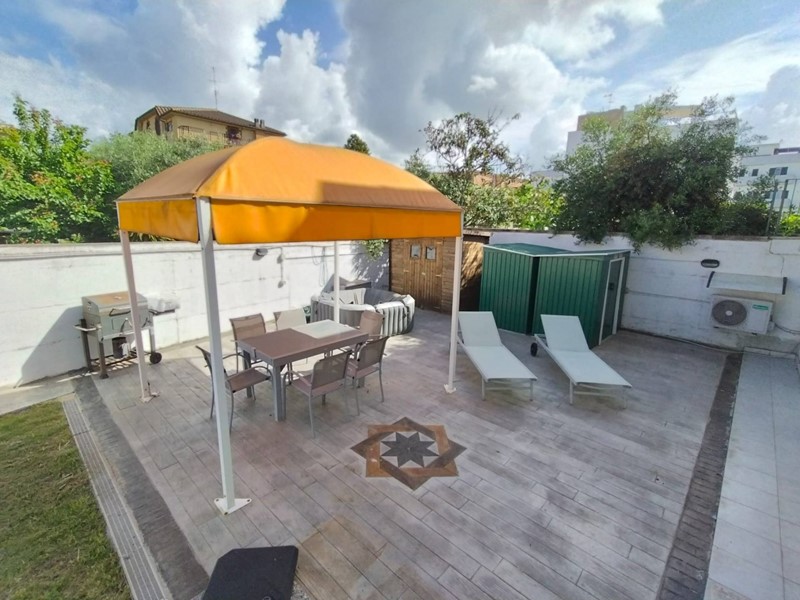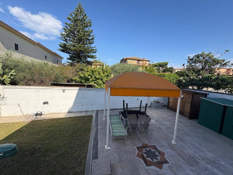 Laccesso alla proprietà avviene tramite un cancello privato che conduce a un primo giardino mattonato, comodo per il parcheggio di più autovetture. Da qui si accede sia alla veranda, dotata di tende da sole, che conduce al giardino principale, in parte verde e in parte pavimentato, arricchito da un gazebo ideale per vivere gli spazi esterni dove rilassarsi nelle giornate di sole e condividere momenti speciali.