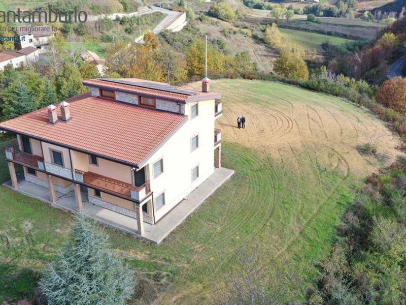 Trattasi di una singola al grezzo in zona residenziale tranquilla posta su tre livelli composta da: piano rialzato circa mq 140: soggiorno-salotto, cucina, tre camere, due bagni, terrazzi e portico, piano primo mq 140: soggiorno-salotto, cucina, tre camere, due bagni, terrazzi, piano secondo mq 75 monolocale mansardato con terrazzo. Possibilità di adattare in base alle esigenze, muro cm 35, panelli fotovoltaici 4 kwatt dell'anno 2019. Ampio terreno giardino, agricolo e bosco di mq 10533.