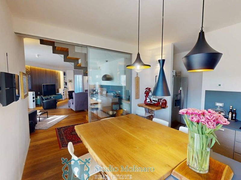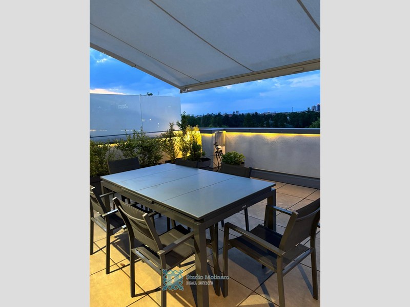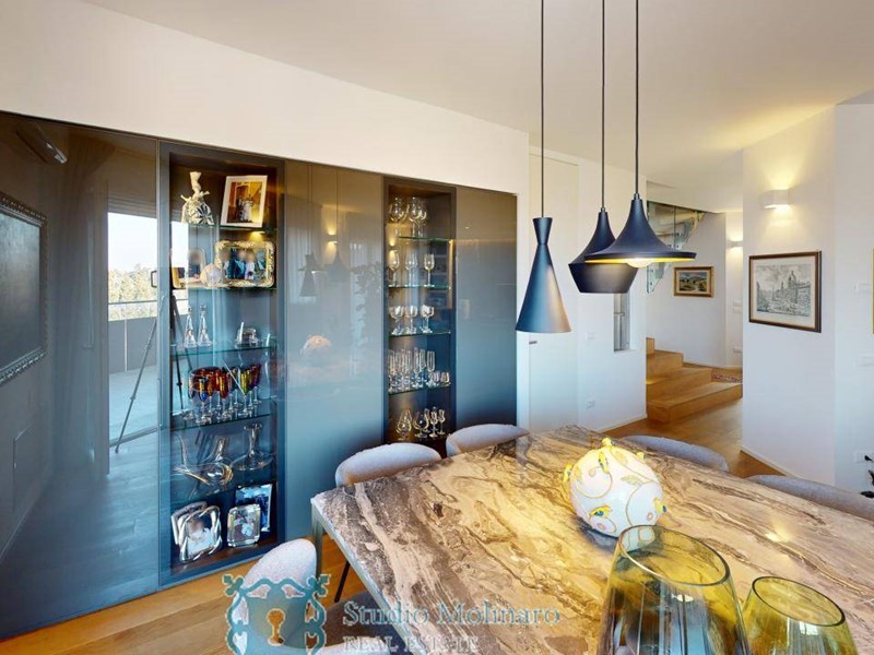 Lingresso, situato al quinto piano, si apre su un elegante e luminoso soggiorno di circa 70 mq, completamente finestrato e impreziosito da affacci su ampi terrazzi interni ed esterni. Una raffinata parete scorrevole in vetro Rimadesio separa il soggiorno dallampia cucina abitabile, che dispone di un pratico accesso alla zona dispensa/lavanderia.