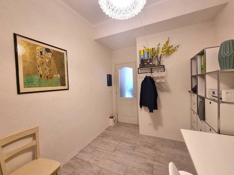 L'alloggio si presenta in ottime condizioni, veniamo accolti da un ampio soggiorno con angolo cottura arredato con gusto, da cui si può uscire su un balcone che affaccia su un giardinetto, da un piccolo disimpegno si accede alla zona notte dove troviamo la camera da letto matrimoniale, uno studio e il bagno.