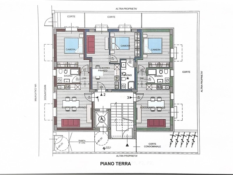 Sono disponibili appartamenti di diversa metratura, con corte privata (al piano terra) o con balconi (al piano primo, secondo e terzo).