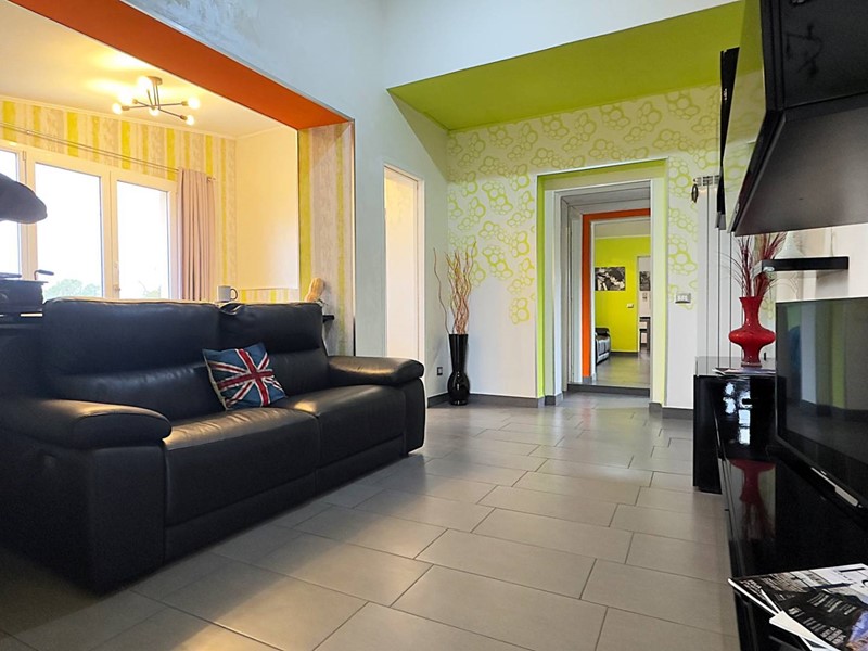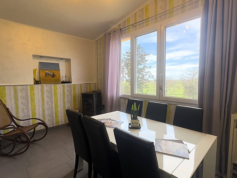 Il soggiorno doppio, adiacente alla cucina, è ben illuminato grazie alle numerose finestre che si affacciano sul giardino privato circostante.