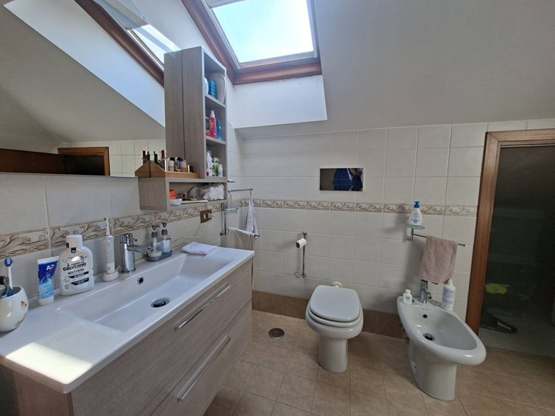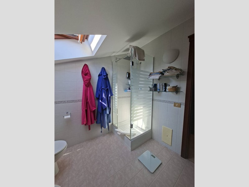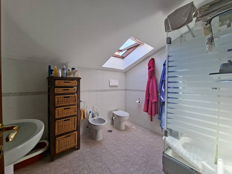 Sono presenti anche 2 bagni moderni e funzionali, di cui uno in camera, dotati di tutti i comfort necessari. L'attico è riscaldato tramite un efficiente impianto a radiatori o pannelli radianti, alimentato a metano.