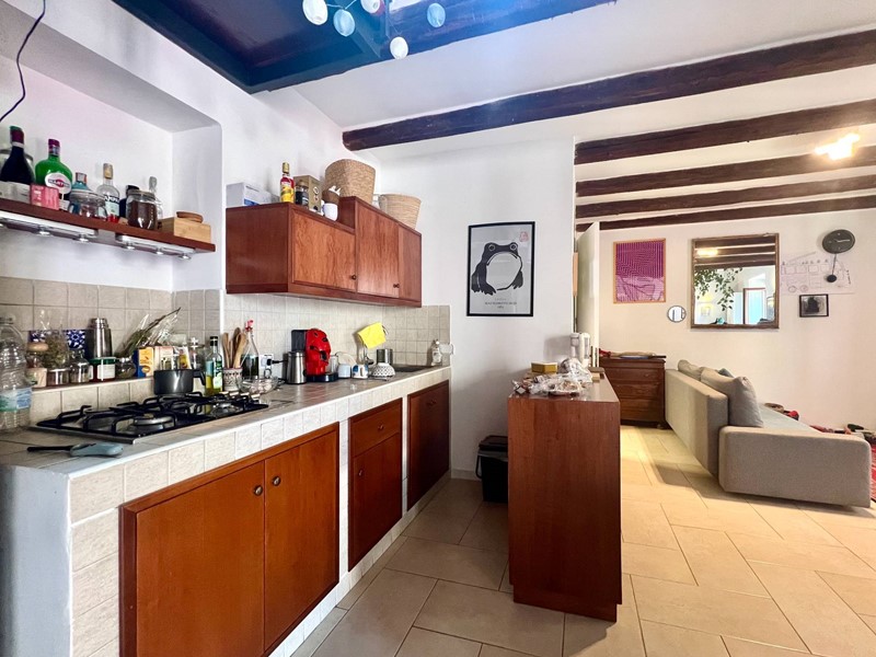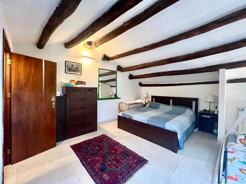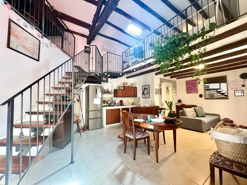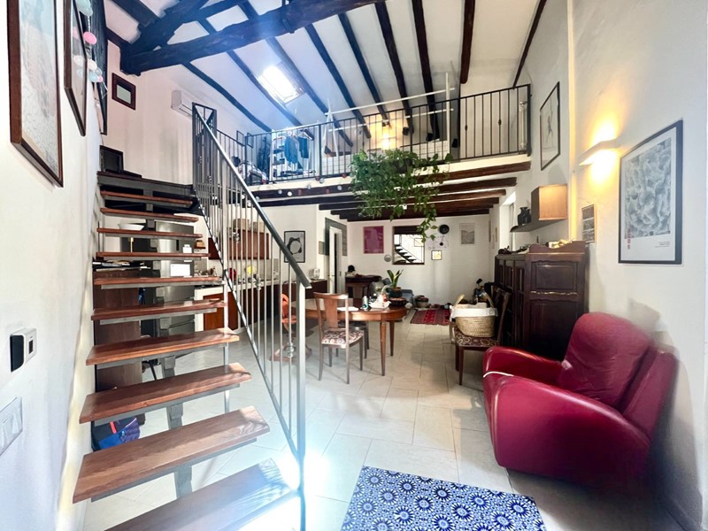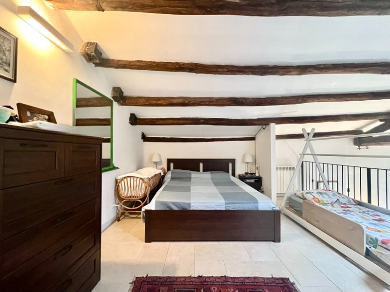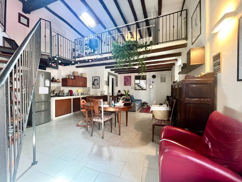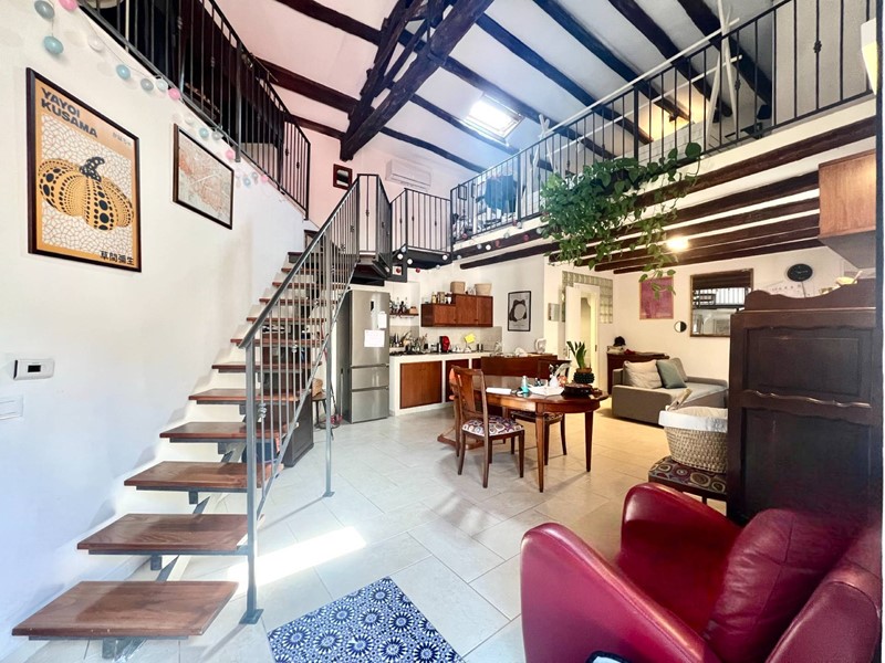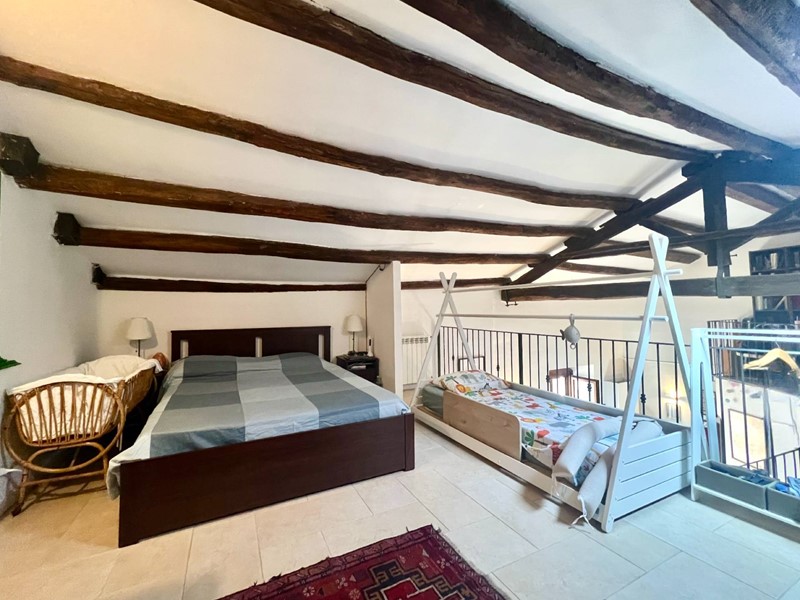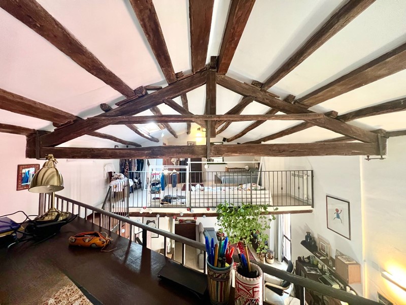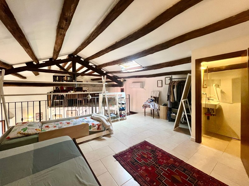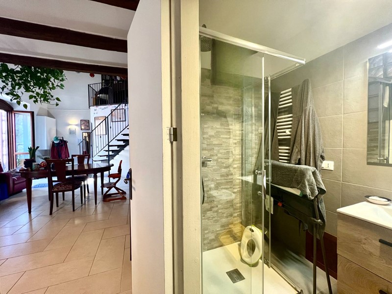 Nella zona giorno si trova anche un bagno moderno, dotato di box doccia e ventilazione forzata, progettato per offrire praticità e comfort. Salendo una scala interna, si accede a un livello superiore che ospita una zona studio e una camera da letto matrimoniale. Questa area è servita da un piccolo WC, un dettaglio che aggiunge ulteriore comodità. La finestra Velux, le travi in legno a vista e la capriata originale conferiscono unatmosfera calda e accogliente, valorizzando leleganza e la particolarità degli ambienti.
