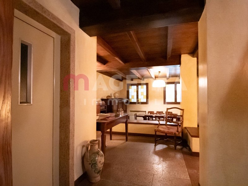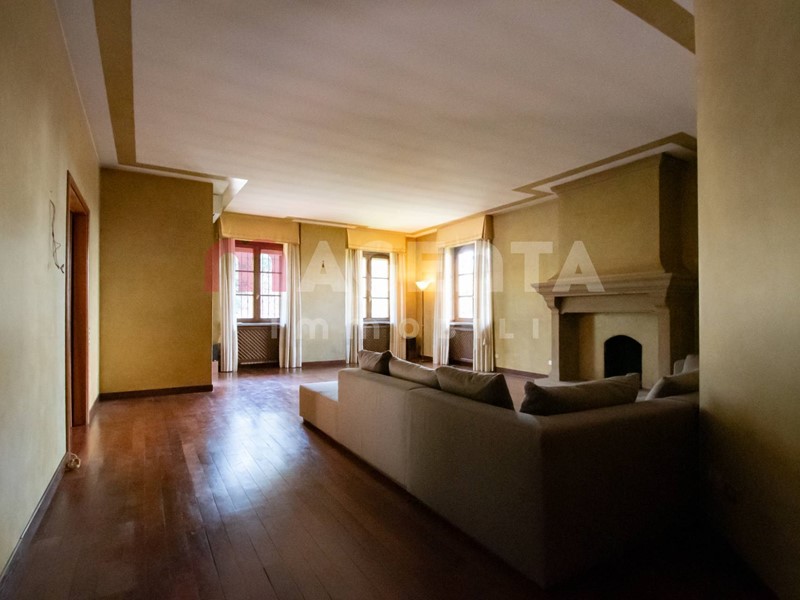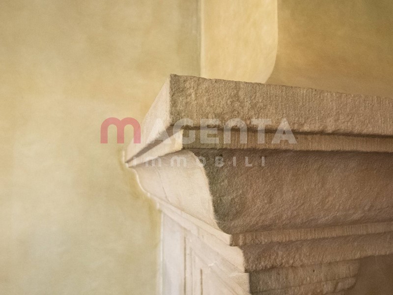 Al primo piano troviamo il grande appartamento che si sviluppa su un piano unico e gode di importanti spazi di rappresentanza e doppio ingresso. La zona giorno è costituita da un ampio salone con camino in pietra, sala da pranzo con boiserie in essenza pregiata che affacciano entrambi su un ampio e panoramico terrazzo. La cucina è spaziosa e abitabile, con adiacenti una stanza, un bagno ed un ripostiglio che possono essere adibiti a locali di servizio.