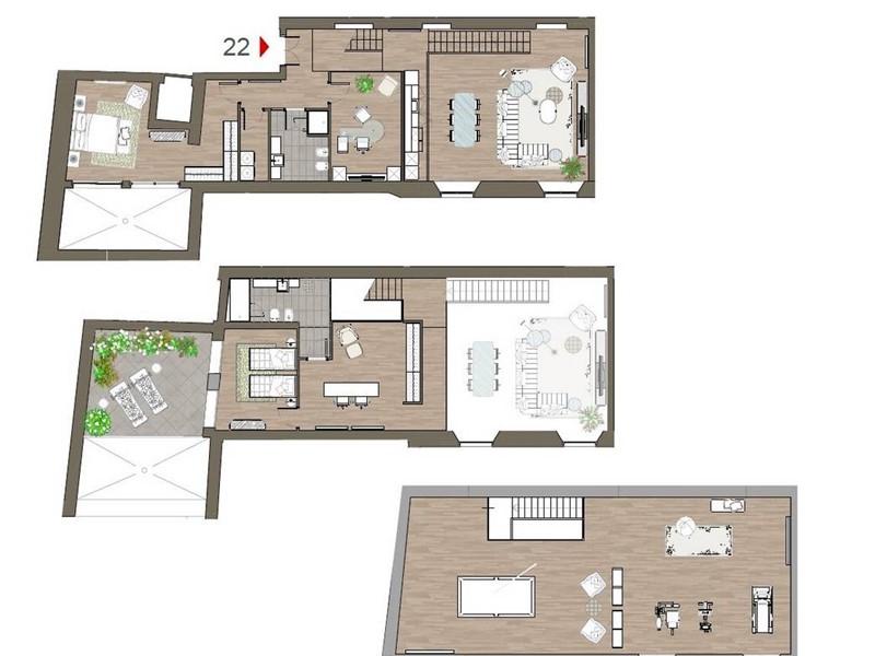 l'immobile si compone da un accogliente ingresso, ampia zona giorno con cucina a vista, lavanderia, una prima camera matrimoniale, bagno con finestra , una moderna scala a vista accompagna al piano superiore dove ospita una camera padronale con cabina armadio, un altro bagno e da uno studio. L'ultimo piano dell'appartamento è la Mansarda, di circa 90 mq utile anche per una suddivisione dei suoi spazi a piacere e adibirla a zona relax, ospiti e tante altre idee idee in base alle vostre esigenze. L'unità è Accessoriata da una comoda Cantina al Piano Interrato, a parte c'è la Possibilità di Acquistare il Garage.