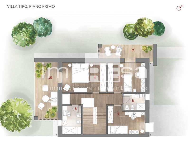 al piano superiore si sviluppa la zona notte con due camere matrimoniali, una camera doppia e doppi servizi.