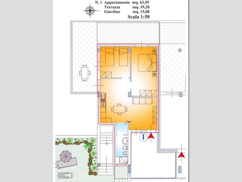 ingresso su soggiorno con angolo cottura, bagno, nr. 2 camere matrimoniali, terrazzo di circa 40 mq. più giardino di circa 15 mq. Possibilità di acquistare a parte un garage oppure un fondaco con altezza 3 mt.