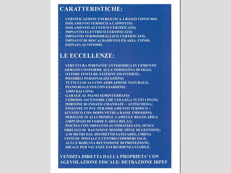 L'appartamento è in fase di realizzazione quindi c'è la possibilità di personalizzarselo, cappotto esterno, impianti certificati, portone blindato, predisposizione aria condizionata, finestre a ribalta in pvc doppio vetro termico e acustico, persiane in alluminio con lamelle orientabili. Costruzione antisismica alla normativa del 2018. Agevolazioni fiscali con detrazione IRPEF su tutto il costo di acquisto anche come seconda casa .