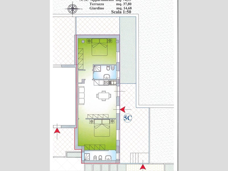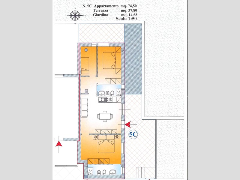 ingresso su soggiorno con angolo cottura, nr. 3 camere, nr. 2 bagni, terrazzo di circa 50 mq. più giardino di circa 15 mq. Possibilità di acquistare a parte un garage oppure un fondaco con altezza 3 mt.