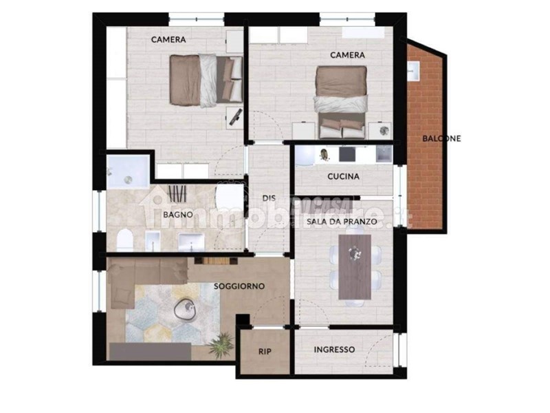 Un ampio ingresso con ripostiglio dal quale si accede ad un ampio soggiorno con angolo cottura separato. due camere matrimoniali e un bagno con finestra.
